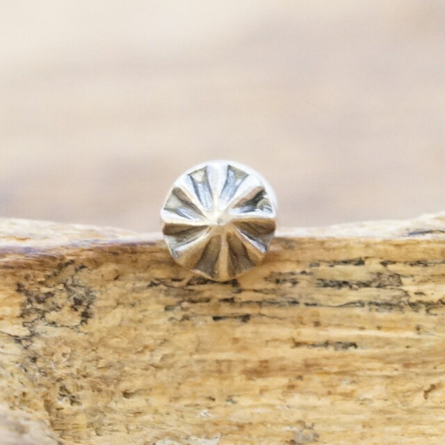 【ノース ワークス】 創業者の橋本毅はアメリカ西海岸カルチャーに心底傾倒し、インディアンジュエリーや60〜70年代ヒッピーのコインワークに魅せられ、独学で技術を極めた。 1992年より神奈川県横浜市においてオーダーメイドジュエリーとインディアンクラフトを中心としたアトリエ、兼カフェをオープン。2006年、在日米軍基地がある東京都福生市に拠点を移したのを機に同じような世界観を持つ仲間が集まり、レザークラフトやビーズワーク等のアイテムを展開する。 橋本が持っていた技術と意志を受け継ぎ、素材の美しさ、ベーシックなデザインを基本として変わらない価値を持つモノを作り続ける。 1点ずつ手作業で作り上げていく為、それぞれ顔があり、作り手のぬくもりと何年経っても褪せることのない素材を感じてもらえるものである。 ナバホ族の伝統的なスタンプワーク技法を施して作製されたコンチョピアス 素朴な雰囲気ながら力強さと繊細さを掛け持ちあわせた普遍的なデザインで、深いスタンプワークが耳元に存在感を与えてくれます。 コンチョはもともと装飾用のボタンとして製作されていましたが、徐々にサイズをかえて、髪留め・ピアス・バックルなどに用いられるようになりました。 古いアメリカ銀貨と同じ銀含有率90.0%の地金を使用する事により経年変化を楽しめ、メンズ・レディース問わずにご使用いただけます。 こちらは1個売りになります。 【商品詳細】 [素材] シルバー900,シルバー925 [付属品] ポーチ [サイズ] 直径 5mm 厚み 3.5mm ※こちらは1個売りになります。 ※お支払い方法に関しましてのご案内※ 予約商品、メーカーからの取り寄せ商品に関しまして、代金引換でのキャンセルが多い為、誠に申し訳ございませんが、代金引換でのお支払いはお受けできませんので、ご了承の程宜しくお願い申し上げます。 クレジットカードは商品入荷時に決済となります。 セブンイレブン・ローソン前払い、銀行振込はご注文日から7日以内にご入金を頂く形となります。NORTH WORKS(ノースワークス)正規販売代理店 Silver900 コンチョ ピアス