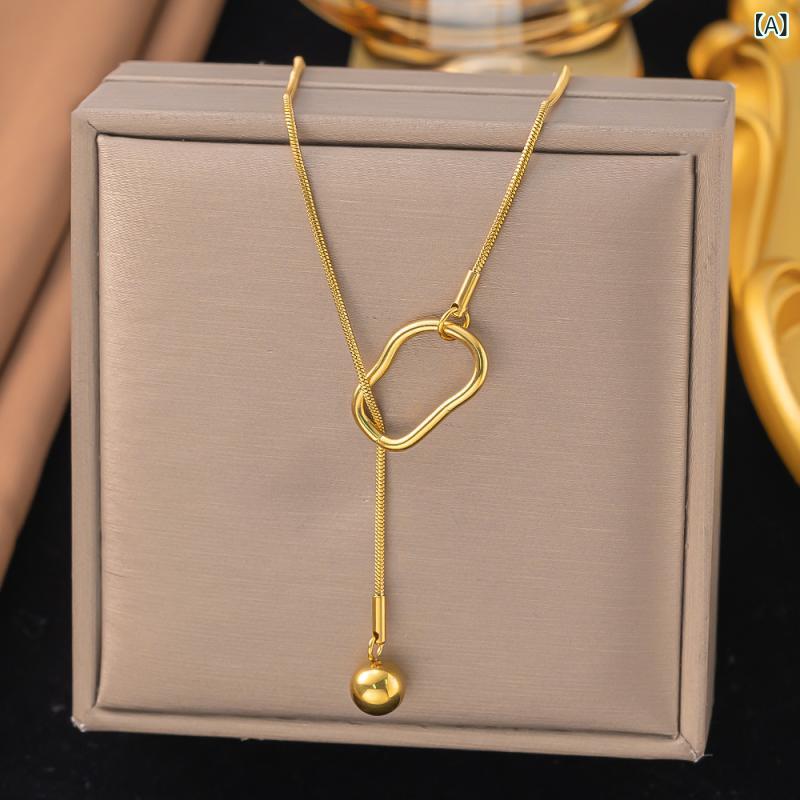 ネックレス レディース 女性用 ロング セーターチェーン シンプル 幾何学 ジオメトリック リング フープ タッセル チタン ステンレス 電気メッキ加工 韓国ファッション フェミニン スイート スネークチェーン ゴールド シルバー