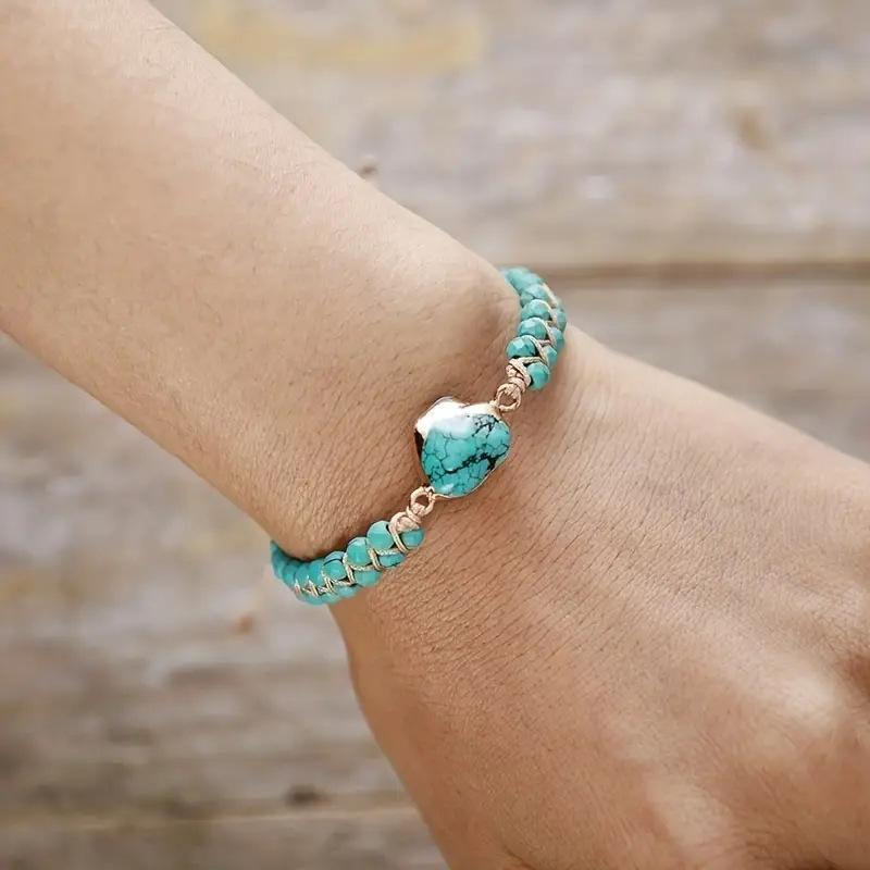 ブレスレット 男女兼用 天然ターコイズ パワーストーン ブルー ゴールド 不規則 ダブルチャーム エスニック ボヘミアン レトロ 幾何学 普段使い 夏 アクセサリー