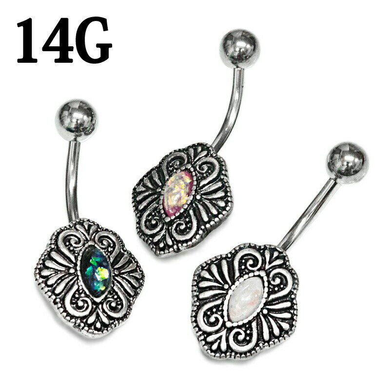ボディピアス 14G ステンレス イミテーションオパールグリッター付きヴィンテージスタイルへそピアス / 14ゲージ シルバー カーブド ヘソピアス ネイブル ロブ トライバル ジェム かわいい かっこいい 臍ピアス