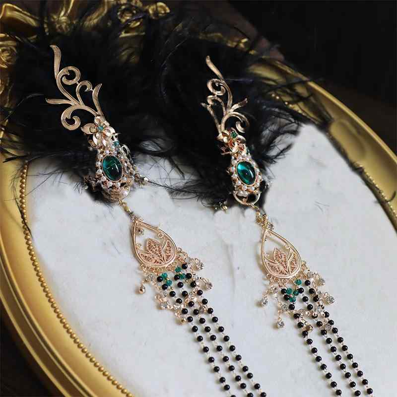 ヘアクリップ レディース レトロ調 漢服風 フェザー フリンジ タッセル ハンドメイド サイドクリップ 歩揺 上品 エレガント 秋冬