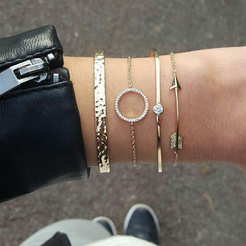 フォーピース バングル ブレスレット セット 4個セット ゴールド 叩き リング 丸型 ラウンド ジュエル 弓矢 アロー 綺麗 シンプル プレーン パベ チェーンブレスレット クリスタル ジルコニア 金色 腕輪 重ね付け メンズ レディース アームレット 手首 彼女 女性 4本 4連