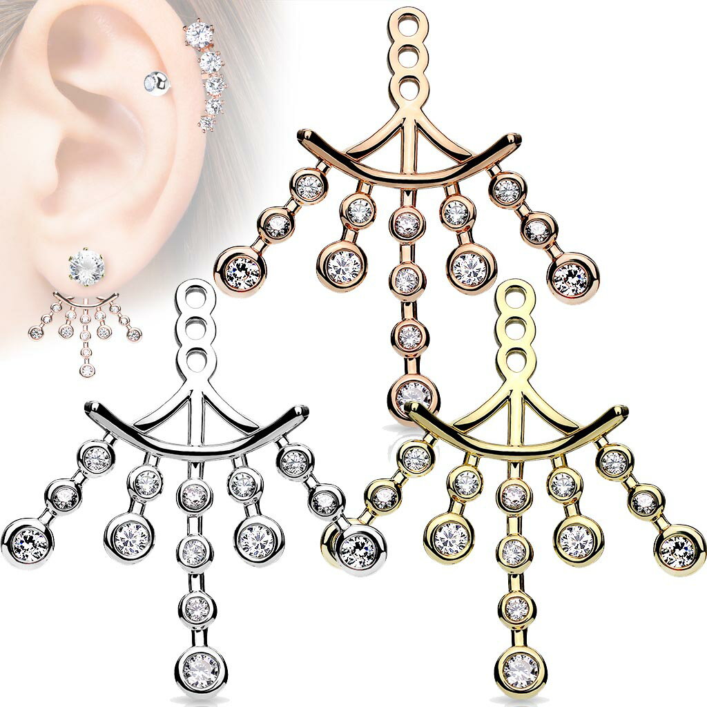 クリスタルのジルコニアでシャンデリアのようなゴージャスなデザインのスタッドピアスやストレートバーベルやラブレットなどのボディピアスをデコレーションできるシールドパーツ。銀色シルバー、金色ゴールド、女性人気のピンクゴールドから選べる上品なシールドパーツ。自分のピアスをカスタムできるオシャレな装飾パーツ。耳の穴の位置に合わせてピアスを差し込む穴が何か所か開いているので、自分にぴったりのサイズを合わせやすい。バックキャッチピアスやジャケットピアスとしたり、耳たぶやヘリックス、アンテナヘリックスをデコレーションできるパーツです。22G、20G、18G、16Gのピアスを通せるので、普通の細いピアスからボディーピアスまで幅広く使えます。パーツのみの販売なので、いつものピアスに簡単にプラスできるのでプレゼントにも最適です。男性からも女性からも人気のシールドパーツ。メンズでもレディースでも使えるのでペアルックにも。(ご購入の際のご注意)・パーツのみの販売です。ボディピアスやピアスは別売りです。 スペック固定に使えるボディピアスの最大サイズ:16ゲージ(1.2mm)デザインサイズ(幅):約26mm※パーツの詳細サイズは画像をご参照ください。素材真鍮(ロジウムメッキ)備考・表示は1ヶの価格です。・写真はイメージです。お客様のモニターにより商品の色やイメージが異なる場合があります。・スペックサイズは目安としての参考値です。多少誤差がある場合がございますので予めご了承ください。