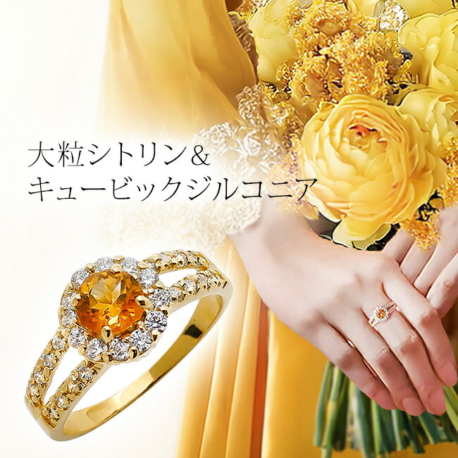 大粒シトリン&キュービックジルコニアリング[シトリン キュービックジルコニア 指輪 高級感 エレガント 華やか プリンセス パーティー イベント お呼ばれ 結婚式 参列 ドレス パワーストーン 金運 財運] 1-2W