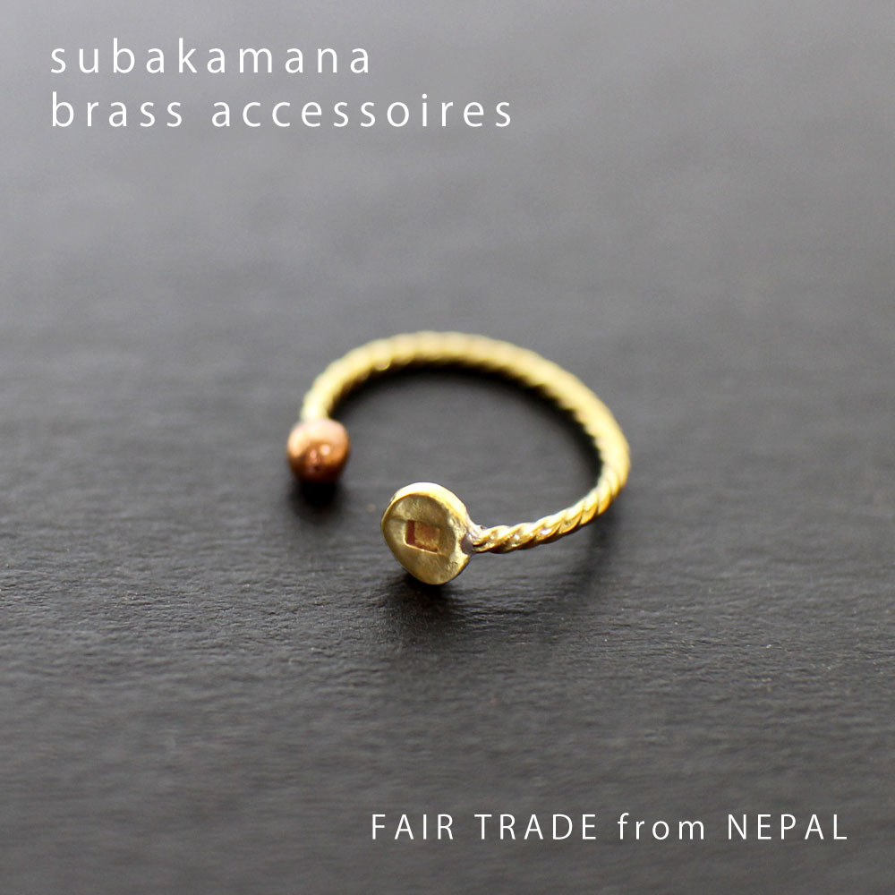 ギフト対応 銅のタネの粒のついた小指用のリング。 繊細なツイストの細いリングで、つけたらモチーフが指を挟んでいるようなおもしろいデザインです。 リング、フットリング、そしてイヤーカフとして3wayで楽しめるリング。 その日の気分やシーンに合わせて、あなたのお気に入りの使いかたを。 Subakamana(スバカマナ) とは相手に幸せを願うときに使うネパールの言葉です。 ネパールの山々や、豊かな自然、幸運にまつわるものからインスピレーションを受け、みなさんにたくさんの幸せが訪れますようにと願いを込めてデザインされました。 subakamanaのアクセサリーは作り手の生活と自立を支えるネパールのフェアトレードNGO「マハグチ」を介して、職人たちが手作りで作っています。 フェアトレードNGO「マハグチ/Mahaguthi」は、ネパールのカトマンズにあるフェアトレードNGOです。ネパール国内の小規模手工芸生産者に技術指導や生産機会を提供し、ネパール国内だけでなく、世界中にフェアトレード商品を届けています。 サイズ モチーフ幅:0.5cm 号数:フリーサイズ 素 材 真鍮 備 考 【真鍮製品について】 真鍮製品は使い込む程にアンティークの様な味わいが出る金属です。 湿気・汗の影響で錆びや黒ずみ、緑青が発生する可能性がございますので、乾いた布でこまめに拭いていただけますようお願い致します。 色の薄い衣類を着用の際は色移りにご注意ください。 生産国 Made in NEPAL 【subakamana】のアクセサリーはこちら<<<* - * - * フェアトレードアクセサリー・ブランド一覧 * - * - *