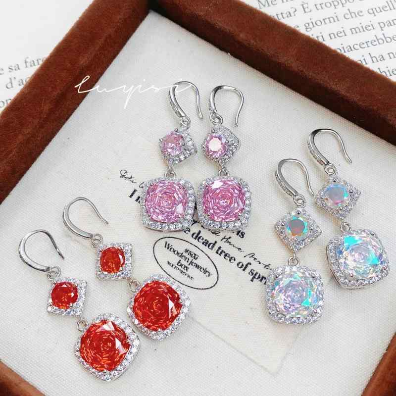 イヤリング レディース 中国赤色 幾何学型 粉色 ジルコニア ドロップ イヤリング レトロ 文芸 復古 銅製 耳飾り アクセサリー