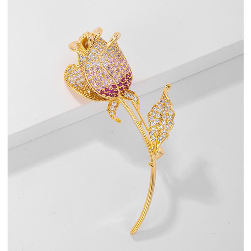 ブローチ レディース 高級感 満載ジルコニア バラ フラワー 韓国風 おしゃれ ファッション エレガント 優雅 秋冬 ジャケット アウター スーツスタイル フォーマル コサージュ 女性用 ピンク ゴールド