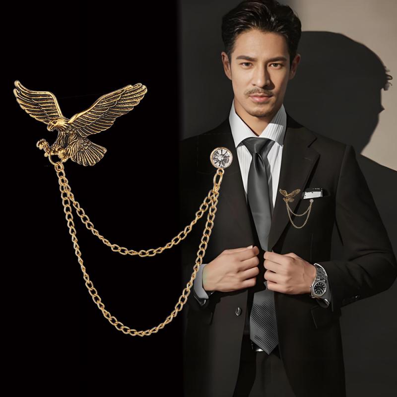 ブローチ メンズ ラペルピン 欧米 レトロ イーグル ワシ 存在感 高級感 亜鉛合金製 スーツ ジャケット フォーマル ビジネス シンプル 羽根 翼 メタル フリンジ アンティークゴールド シルバー(x2)