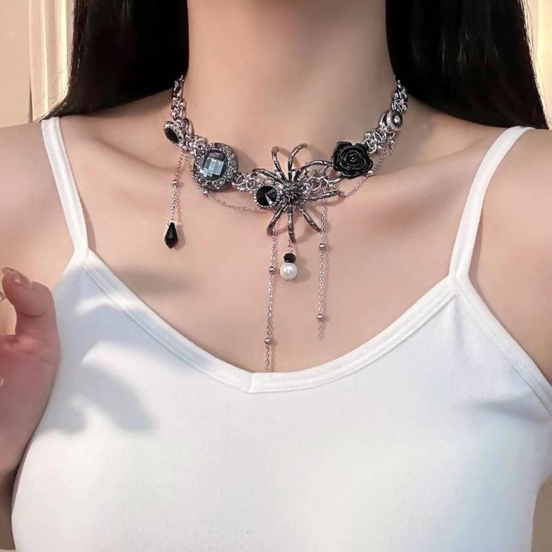 ネックレス レディース 蜘蛛チャーム ローズ タッセル 鎖骨チェーン チョーカー パンク スイートクール 甘辛ミックス 個性的 デザイン性 精巧 おしゃれ 万能 合金製 ジルコニア