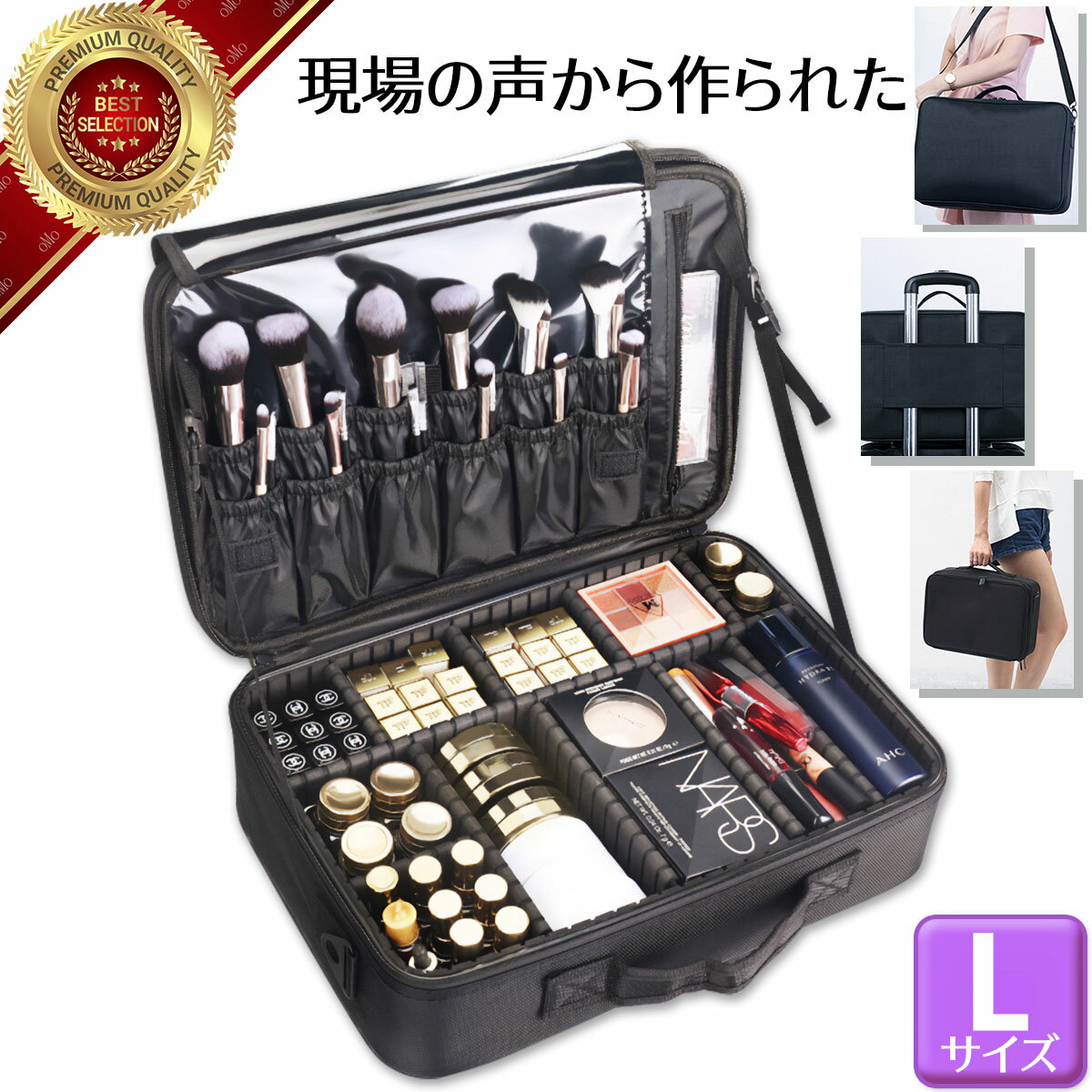 ※こちらは、Lサイズのページでございます。 サイズにより画像との形状が異なります。ご注意ください。化粧品は入っておりません。 たくさんの化粧品を収納出来て、スタイリッシュで持ち運びに便利なメイクボックスをお探しではありませんか? いろいろなメイクボックスは市販されていますが、なかなか思うようなものが見つからないですよね。 当店oMoのメイクボックスは、中に仕切りもついていますし、頑丈な設計、持ち運びにも大変便利で、 見た目もスタイリッシュ。 メイク道具だけでなく、他の道具を入れてお使いいただく方も多くいらっしゃいます。 外観がおしゃれだから、通常のバッグとしてもお使いいただいています。 用途に合わせて、サイズも豊富にご用意しております。 プロの方からの評判が高いことから、品質の良さはご理解いただけるかと思います。 当店oMoは卸売や仲卸を通さないため、他店では実現できない格安でご提供しています。 もし、思ったような品質でない場合は、キャンセル返金も承っております。 販売してから売れ行きが好調のため、在庫には限りがあります。在庫切れの場合はすみません。 また、ご承知の通り円安が進んでいますので、価格は今後上げていく可能性が高いです。 本商品の保証期間も45日間あり、ご購入から30日までですと無条件で返品キャンセル可能です。 ※商品の片道返送料はお客様のご負担でお願いしています。 今すぐ本商品をお求めいただき、品質の良さと利便性をぜひご体感ください。 ■特徴 日常からプロ用までご利用いただけるメイクバッグです。 防水材質、位置を調整できる仕切り板設計の為、使い勝手抜群。 調整つ出来るサポートベルトがついてくるので、使用中にケースが閉まらないよう固定可能。 ボディはハードで大変丈夫です。 旅行にも最適、キャリーバーループ付きなので固定出来て大変便利です。 持ち運び3way、肩掛け、キャリーケースに固定、持ち手をにぎる。 ■商品説明 材質:オックスフォード 生地 サポートベルト:有り 規格:L 重量:1.6kg サイズ:40*29*14cm キャリーバーループ:有り 持ち運び方法:手持ち 肩かけ ※手作業による測定の為、若干の誤差が生じる場合がございます。 ※製造時期により、ロゴマークが無いものもございます。 ※仕切りによる摩耗部分等はご了承ください。 ※使用に問題ない部分でのキズがある場合があります。ご了承ください。 楽天ランキング1位獲得 4冠 2022/3/31 09:19,6/4 09:04,11/19 05:19,11/28 23:20 メイクアップアーティスト 彫り師 日常 移動 旅行 メイクアップ 家 大きい 中身 かわいい バッグ メンズ メイク収納 無印 10代 20代 30代 40代 コスメポーチ コスメボックス コスメケース コスメ 送料無料 化粧品収納ボックス コスメ収納 ジュエリーケース 化粧品入れ 高品質 ケース 化粧ボックス 化粧箱 メイク バニティケース 仕切り 母の日 敬老の日 父の日 あす楽 安い 人気 クーポン おすすめ※!こちらは、Lサイズのページでございます。 サイズにより画像との形状が異なります。ご注意ください。!化粧品は入っておりません。