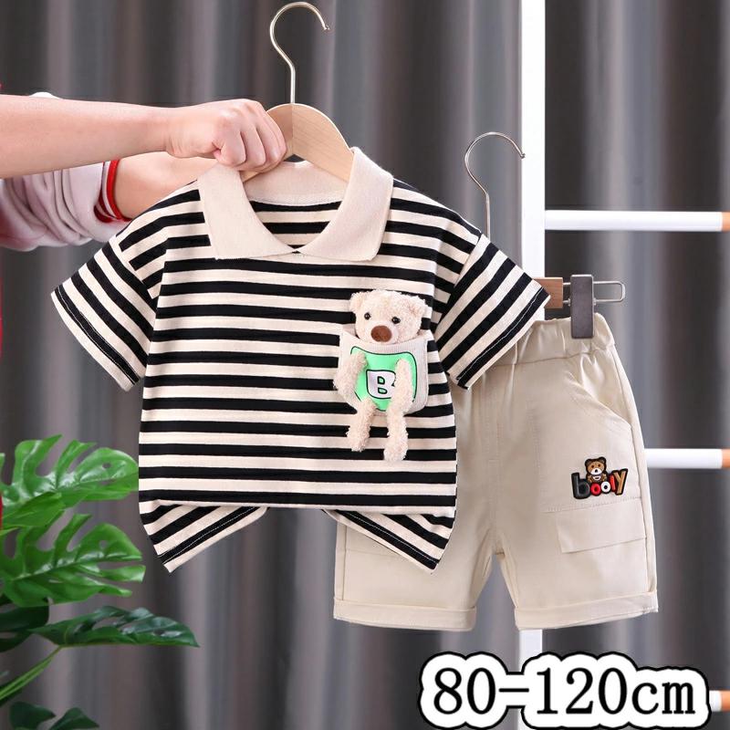2点セット 上下セット 男の子 ベビー服 子供服 ベビーセットアップ 半袖 ボーイズ ベビーTシャツ 子供Tシャツ ベビーショートパンツ アウター ブラック ブルー グリーン 出産祝い 通気性 縞柄 可愛い 柔らかい ソフト ハンサム 写真 春夏 1歳2歳3歳 80 90 100 110 120