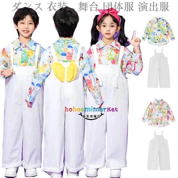 キッズダンス衣装 長袖シャツ+サロペット 運動会 子供服 女の子 男の子 緑シャツ 赤シャツ オーバーオール 舞台 団体服 演出服 セットアップ かわいい シャツ サロペット パンツ 長ズボン 文化祭 写真撮影 発表会 イベント モデル服 練習着 100-180 小学校、幼稚園