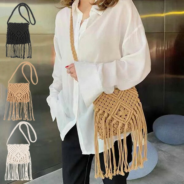 【取り寄せ対応】ショルダーバッグ ポシェット マクラメ編み フリンジ ニット ミニ 小さい 斜めがけ 肩掛け バッグ 鞄 レディース ブラック コーヒー ホワイト