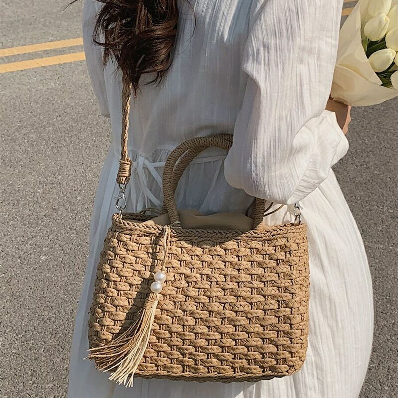 軽量 フリンジ装飾 巾着デザイン 麦わら バッグ、ティーンガール、ビーチ、バケーション、目をひくビーチバッグ 夏、レディース夏用ストローバッグ、ホットなビーチバッグ レディース、ファッション夏バケーションバッグ、バケーション&ホリデーレディースバッグ