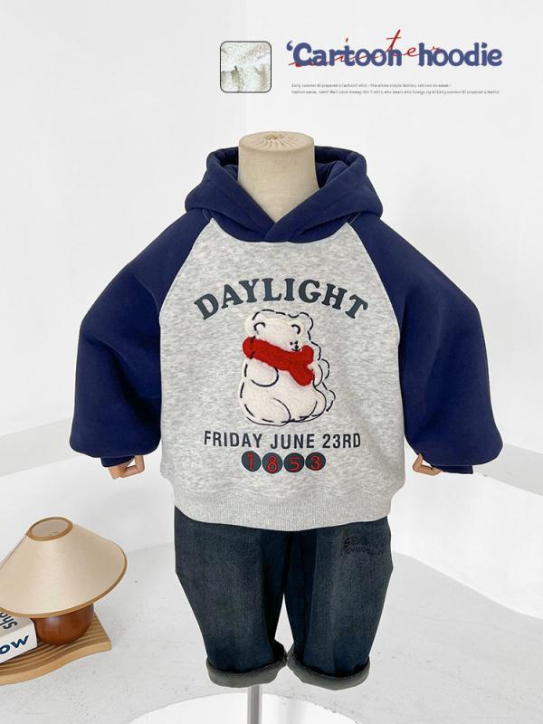 秋冬 男児 フーディー 韓国風 ベア柄 スカーフ付き 一体型フリース コントラストカラー 暖か 子供服 スウェット トップス 吸湿速乾 軽量 綿素材
