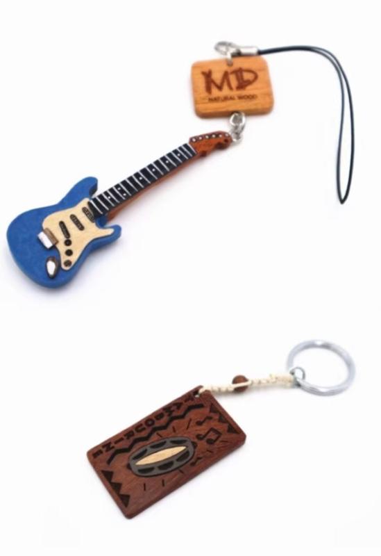 ギター キーホルダー おしゃれ バッグ 吊り下げ ロック 音楽 楽器 木製 バイオリン タンバリン カード ギフト 小さめ 青 英字 リング ストラップ