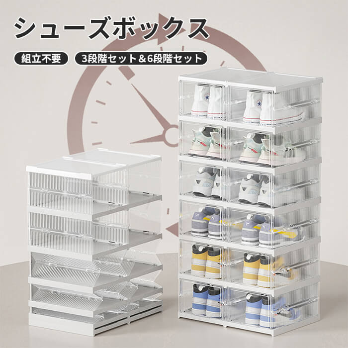 商品仕様商品名:折りたたみシューズボックス 3段階セット&6段階セット商品サイズ(折り畳み前):3段階セット:幅25.5×高54×奥34.5CM6段階セット:幅25.5×高34.5×奥105.5CM商品サイズ(折り畳み後):3段階セット:34.5*25.5*10.8CM6段階セット:34.5*25.5*18.5CM重量:3段階セット:2.39KG6段階セット:4.3KG材質:PP+PS+TPE【シューズボックス】透明な材質で観賞用としてもお使いいただけます。靴のデザインを見せるため横向き入れる事ができ、部屋の中で見せる収納ができます。 大きめのケースはハイカットの靴もゆとりを持って収めることができます。【収納便利&防塵防水】シンプルなデザイン、大容量式で小物に便利なように重ねることができます。透明なマットな質感、収納物が探しやすいタイプです。まだ防塵と防水を兼ねます。【スペースを有効活用】34.5cm奥行があるタイプですので、容量が大きく、有効的に、たっぷり収納ができます。並べて、積み重ねて、レイアウト自由に収納をカスタマイズ!収納したい場所にあわせて連結やスタッキングで自在に対応できます。【雑貨や小物入れにも】靴の収納以外にもお使いいただけます。コレクションボックスとして最適です。クリアな素材なので衣類や雑貨など、中身が一目で分かるので使いやすいです。商品仕様商品名:折りたたみシューズボックス 3段階セット&6段階セット商品サイズ(折り畳み前):3段階セット:幅25.5×高54×奥34.5CM6段階セット:幅25.5×高34.5×奥105.5CM商品サイズ(折り畳み後):3段階セット:34.5*25.5*10.8CM6段階セット:34.5*25.5*18.5CM重量:3段階セット:2.39KG6段階セット:4.3KG材質:PP+PS+TPE【シューズボックス】透明な材質で観賞用としてもお使いいただけます。靴のデザインを見せるため横向き入れる事ができ、部屋の中で見せる収納ができます。 大きめのケースはハイカットの靴もゆとりを持って収めることができます。【収納便利&防塵防水】シンプルなデザイン、大容量式で小物に便利なように重ねることができます。透明なマットな質感、収納物が探しやすいタイプです。まだ防塵と防水を兼ねます。【スペースを有効活用】34.5cm奥行があるタイプですので、容量が大きく、有効的に、たっぷり収納ができます。並べて、積み重ねて、レイアウト自由に収納をカスタマイズ!収納したい場所にあわせて連結やスタッキングで自在に対応できます。【雑貨や小物入れにも】靴の収納以外にもお使いいただけます。コレクションボックスとして最適です。クリアな素材なので衣類や雑貨など、中身が一目で分かるので使いやすいです。