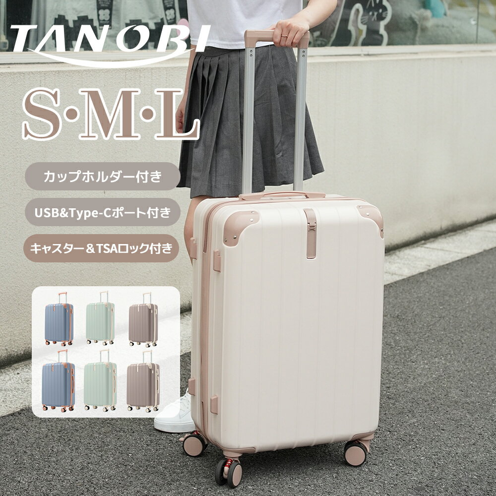 【P5倍+限定クーポン!】【S/M/Lサイズ】スーツケース USBポート TANOBI キャリーバッグ ストッパー付き キャリーケース カップホルダー スマホスタンド 超軽量 ファスナー式 TSAロック搭載 フック機能付き 可愛い 2~14泊 小型/中型/大型 大容量 静音 おしゃれ
