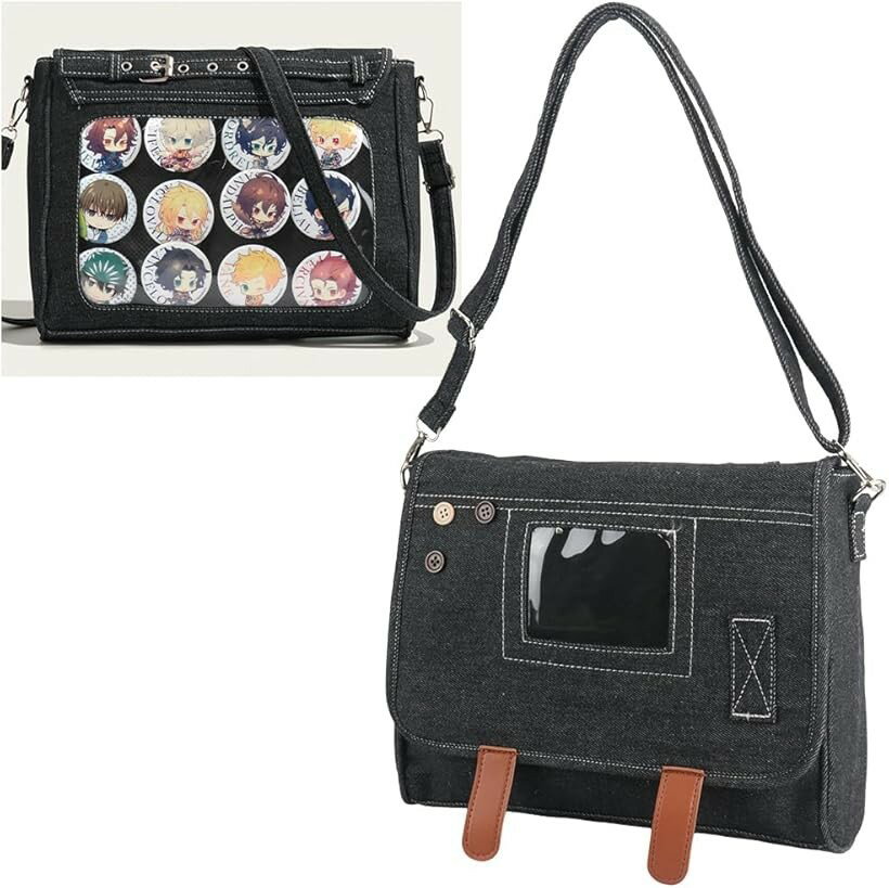 推し活用痛バッグ デニム製 両面仕様 クリア窓付き デコレーション 缶バッジ アクスタ トレカ 肩掛け 男女兼用 (ブラック)