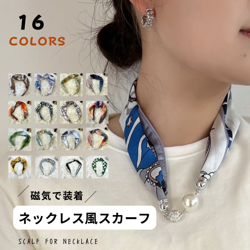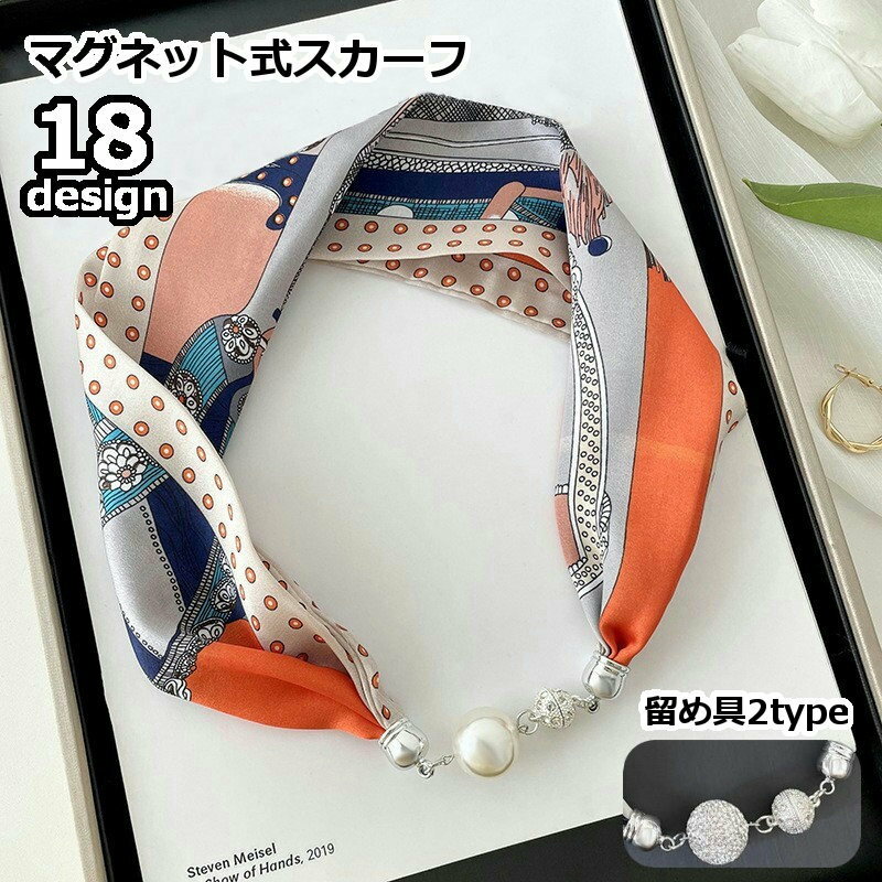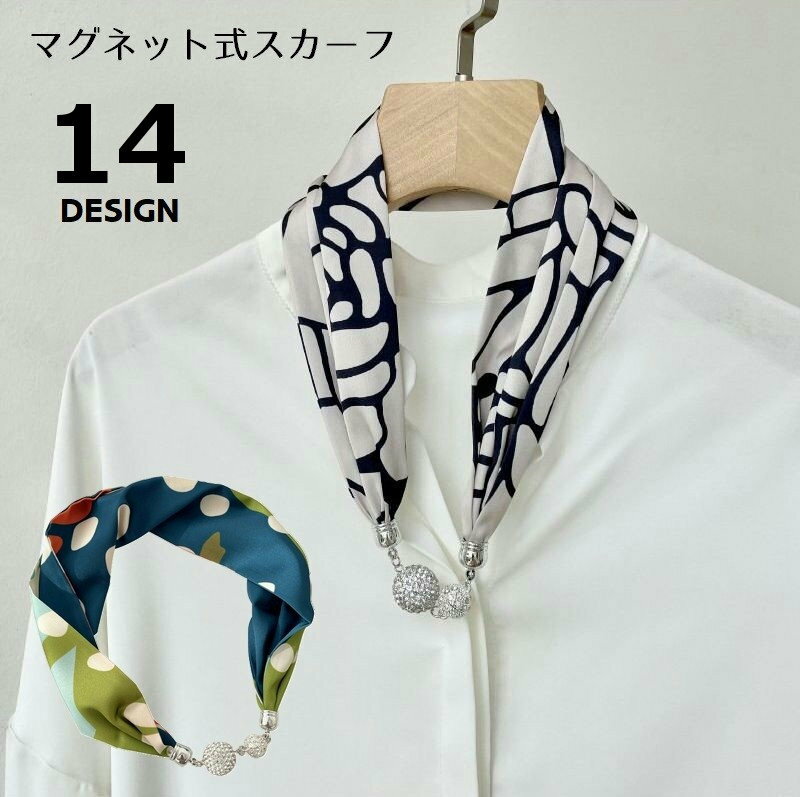 送料無料 スカーフ マグネット式 レディース ワンタッチ 簡単 ネックレス風 ラインストーン プリント シルクタッチ エレガント きれいめ