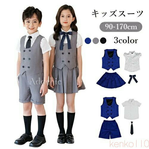 ■商品詳細:■サイズ:90/100/110/120/130/140/150/160/170■セット内容:男の子:4点セットベスト/シャツ/パンツ/ネクタイ女の子:4点セットベスト/シャツ/スカート/リボン ■素材 ポリエステル 注意事項:※サイズ表は平置きで測定しております。多少の誤差がある場合がございます。※撮影の為、画質等の関係上、色などが実際の商品と若干違ってしまうこともあるかもしれませんが、予めご了承ください。 フォーマルスーツ 3色 子供スーツ 4点セット 女の子 男の子 キッズ フォーマル服 入学式 卒業式 セットアップ 春 夏 ベスト シャツ 半袖 パンツスーツ スカート 制服 受験 七五三 卒園 入園 小学生 中学生 結婚式 演奏会 発表会 ジュニア 90-170cm【高品質なつくり】縫製など細部まで丁寧に作られております。質感、細部にまでこだわった子供スーツです。 【選べるサイズ】幅広いサイズ展開で、お子様にぴったりサイズを選べ綺麗に着こなせます。兄弟姉妹でお揃いコーデもかっこいい! 【様々なシーンにおすすめ】学園祭、文化祭、発表会、入園式、入学式、誕生日、パーティー、司会、演出などフォーマルな場合にぴったり!七五三の記念撮影、クリスマスプレゼントにもOKです。