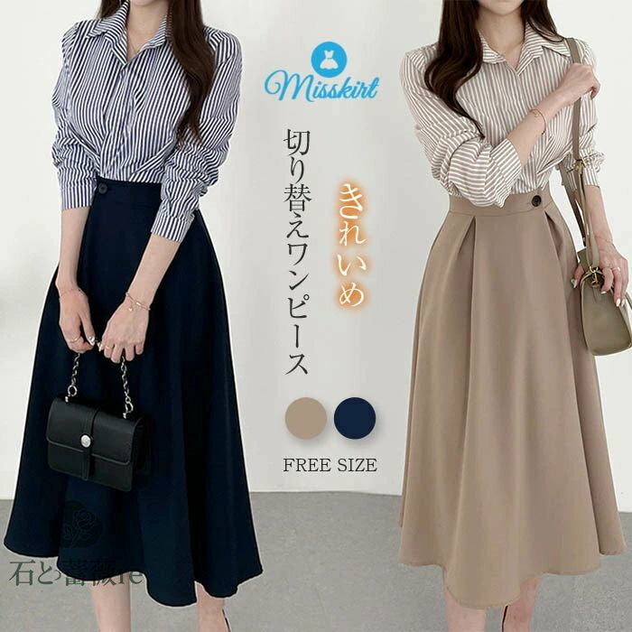 シャツワンピース レディース ロングワンピース ワンピース ワンピ 長袖 夏 きれいめ バイカラー ストライプ 切り替えワンピース フェイクレイヤード 秋 春 長袖 ワンピース 上品 オシャレ 体型カバー ロング丈 ミモレ丈 着痩せ 上品 フォーマル 20代 30代 40代