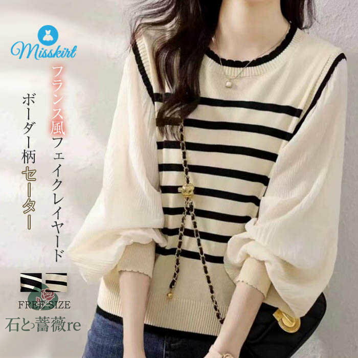 ニット セーター トップス レディース 秋 冬 新作 長袖 ニットセーター カットソー ボーダー ラウンドネック プルオーバー フェイクレイヤード 大人 体型カバー ゆったり レトロ エレガント カジュアル 20代 30代 40代 かわいい シンプル 通勤 OL おしゃれ 送料無料