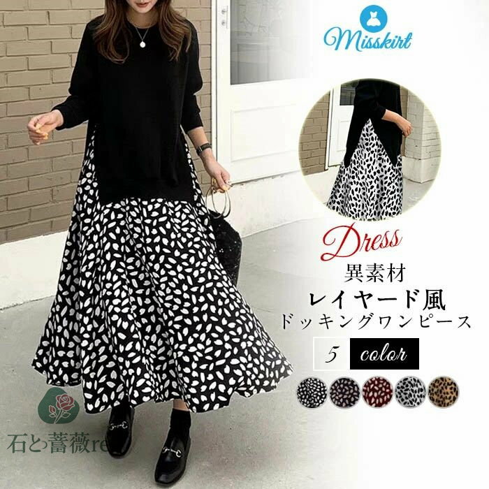 異素材 ワンピース ドッキングワンピース ロングワンピース フェイクレイヤード レディース フレア ニットワンピース 体型カバー ドッキングワンピース 春 秋 冬 大きいサイズ 切り替え 秋冬 着痩せ 美脚 通勤 重ね着 送料無料 20代 30代 40代