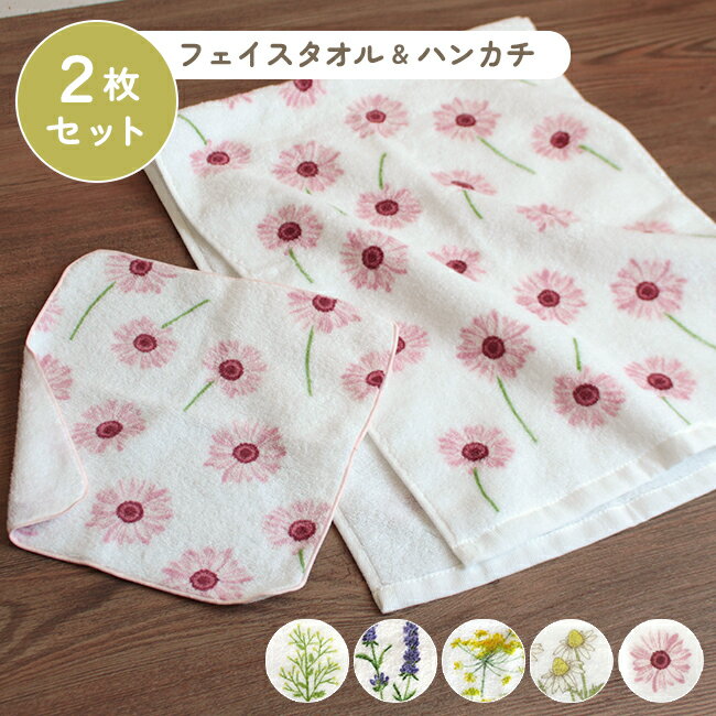 フェイスタオル ハンカチ 2枚セット 花柄 ふわふわ 無撚糸 日本製 綿100% ピンク お花 ナチュラル 草花 ハーブ フラワー ガーベラ カモミール フェンネル ラベンダー 母の日 プレゼント 実用的 ボタニカル コットン レディース レコンプランニング