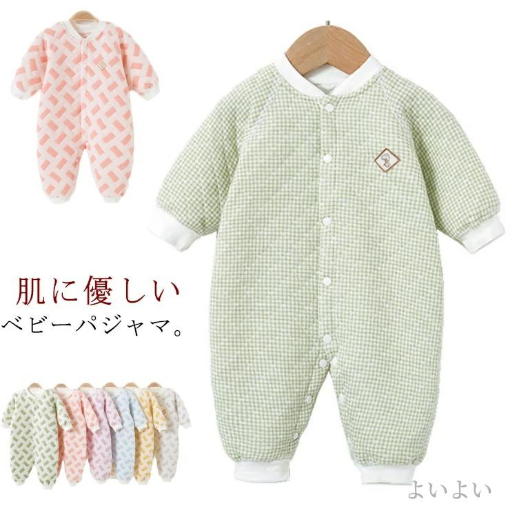 肌に優しいベビーパジャマ。 肌にやさしい綿100%素材を採用、柔らかくて着心地抜群! 首すわり前でもお着替えがしやすい前全開スナップボタン留め仕様です。中わた入りのニットキルトで身体全体をふんわりあたたかく包みます。 カバーオールタイプなので、寝ている間にお腹が冷えてしまう心配もありません。 サイズ66 73 80 90 100サイズについての説明66 着丈47 袖丈22 バスト51 参考体重4−6kg 参考身長60−65cm 73 着丈52 袖丈24 バスト54 参考体重5.5−7.5kg 参考身長65−70cm 80 着丈57 袖丈26 バスト57 参考体重7−9kg 参考身長70−75cm 90 着丈62 袖丈28 バスト60 参考体重8.5−11kg 参考身長75−83cm 100 着丈67 袖丈30 バスト63 参考体重11−13kg 参考身長80−90cm素材綿色1 2 3 4 5 6 7 8 9 10 11 12備考 ●サイズ詳細等の測り方はスタッフ間で統一、徹底はしておりますが、実寸は商品によって若干の誤差(1cm〜3cm )がある場合がございますので、予めご了承ください。 ●商品の色は、撮影時の光や、お客様のモニターの色具合などにより、実際の商品と異なる場合がございます。あらかじめ、ご了承ください。●製品によっては、生地の特性上、洗濯時に縮む場合がございますので洗濯時はご注意下さいませ。▼色味の強い製品によっては他の衣類などに色移りする場合もございますので、速やかに(脱水、乾燥等)するようにお願いいたします。 ▼生地によっては摩擦や汗、雨などで濡れた時は、他の製品に移染する恐れがございますので、着用の際はご注意下さい。▼生地の特性上、やや匂いが強く感じられるものもございます。数日のご使用や陰干しなどで気になる匂いはほとんど感じられなくなります。