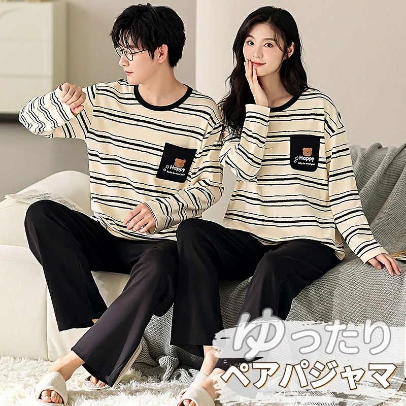 カップル パジャマ ルームウェア ペアパジャマ 長袖 メンズ レディース ペア パジャマ 寝巻き パンツ 上下セット セットアップ 寝巻き 寝間着 ラウンドネック ストライプ お揃い ギフト 結婚祝い プレゼント 韓国風 ペアで揃えられる ペアルック 部屋着 春 秋 カジュアル