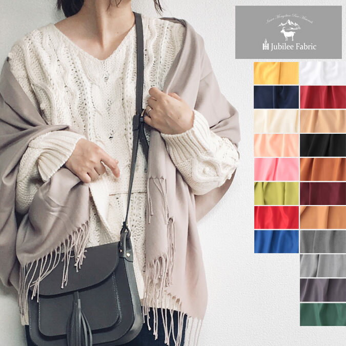 ジュビリーファブリック 200×70cm Jubilee Fabric スーパー スムース マテリアル マフラー Jubilee Stole プレーン 無地 商品詳細 商品名:jf-m36 【カラー】 01. PURE WHITE / ピュアホワイト 02. OFF WHITE / オフホワイト 03. GREY / グレー 04. MIST GREY / ミストグレー 05. LIGHT GREY / ライトグレー 06. BLACK / ブラック 07. NAVY / ネイビー 08. GREGE / グレージュ 09. BEIGE / ベージュ 10. CAMEL / キャメル 11. BROWN / ブラウン 12. BURGUNDY / バーガンディー 13. WINE / ワイン 14. RED / レッド 15. PINK / ピンク 16. PEACH PINK / ピーチピンク 17. MUSTARD / マスタード 18. PSTACHIO / ピスタチオ 19. MOSS GREEN / モスグリーン 20. ROYAL BLUE / ロイヤルブルー 【素材】スムースアクリル100% 【サイズ詳細】約 長さ 約200cm × 幅 約70cm ※素材の特性上目安サイズとなっております。 Super Smooth Material Stall ジュビリーファブリック なめらかな肌触りが特徴のスムースアクリル100%の大判ストール。 やわらかくなめらかな肌触り。 しっとりと肌に馴染みます。 羽織っても巻いても、使い勝手の良い大判サイズです。 スムースアクリルは特殊な製法によって生み出された 極細のマイクロアクリル繊維を使用し、 やわらかな風合いを追求した上質な素材です。 一切チクチクせず、 カシミヤのようなさわり心地で高級感があります。 マフラーやひざ掛けとして幅広くお使い頂けます。 また静電気が起きにくく、毛玉が付きにくい。 洗濯機での洗濯が可能なのも嬉しいポイント。 おでかけ時やオフィスの寒さ対策として、 バッグに収納して持ち運ぶにも便利なボリューム感。 秋冬ファッションに馴染む豊富なカラーで コーディネートに合わせて揃えたくなるアイテムです。 ※商品の特性上、若干のほつれや糸混じりがある場合がございます事、ご了承の上お買い上げいただけますようお願いいたします。
