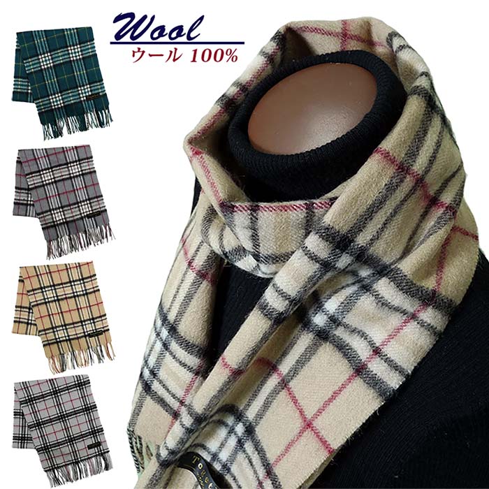 ウール 100% チェック柄 レディース メンズ 男女兼用 マフラー ストール 64152 シンプル 定番 通勤 通学 プレゼント コート下 カジュアル グレー ベージュ グリーン