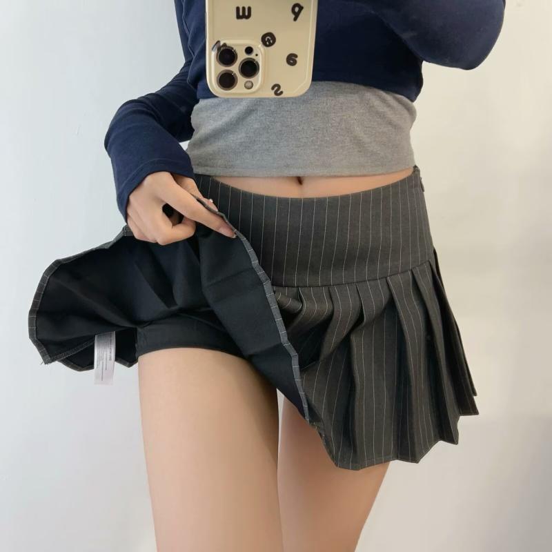 レディース ミニスカート Y2K ストリート レトロ 個性的デザイン ストライプ柄 プリーツ ハイウエスト Aライン スリムフィット グレー 春夏