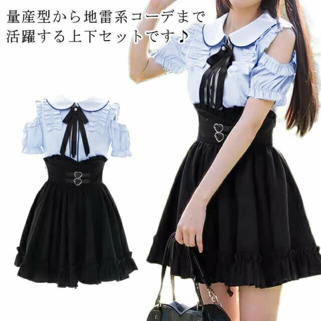 ブラウス 地雷系 スカート 2点セット セットアップ かわいい レディース 肩開き トップス 半袖 Aライン 量産型 病みかわいい 参戦服 ハートベルト フリル ミニスカート ハイウエスト フレア ボトムス春 夏 秋 おしゃれ ロリータ ゴスロリ 送料無料