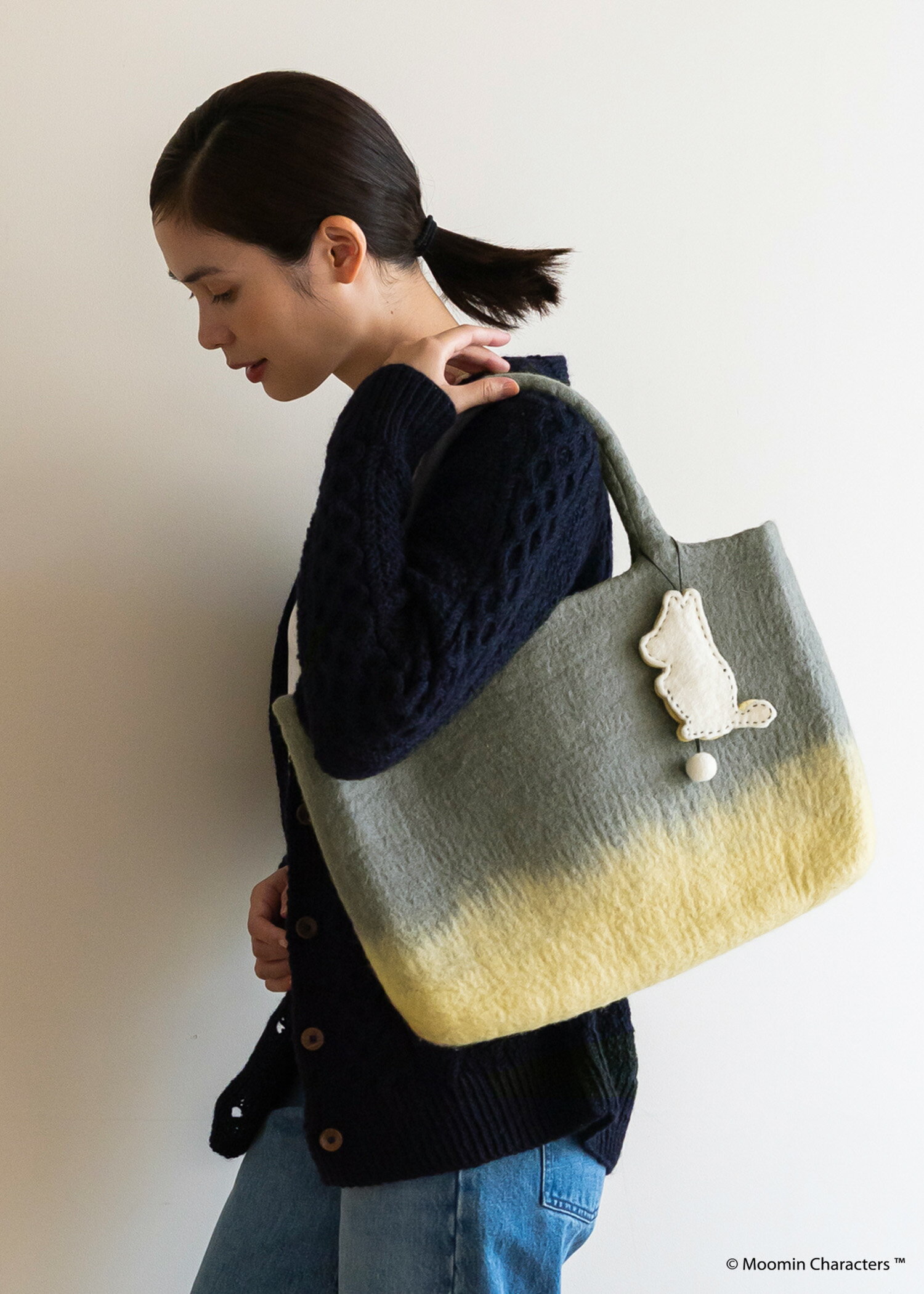 北欧の芸術家トーベ・ヤンソンの作品「ムーミン」と、エシカルファッションの「ピープルツリー」によるコラボレーションシリーズ。 ひとつひとつ手仕事で成形した、四角いシルエットのフェルトバッグです。ライトグレイとイエローの配色とグレーとグリーンの配色を、手仕事で絶妙なグラデーションに表現しています。 ハンドルまで一体型のデザインで型崩れしにくくなっています。薄型ですがノートやタブレットも収納できて、肩にも掛けられる仕様。それぞれムーミンとスナフキンのキーチャーム付きで、かぎが迷子になることはありません。 【エシカルポイント】ネパールの伝統的なフェルトの手工芸は、熟練の職人が羊毛を少しずつ重ね、時間をかけてひとつひとつ成型してつくっています。●ウール100%、メタルリング/手工芸生産者連盟(ACP)/ネパールより※画像は、撮影時の光の当たり具合や、パソコン・スマートフォンの環境により、実際の色味と違って見える場合があります。 タテ約28×ヨコ約40×マチ約6cm、持ち手約45cm※ラッピングをご希望の方は こちら よりラッピングサービス(税込550円)をご追加ください。