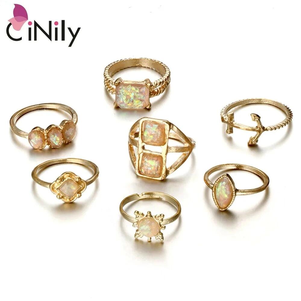 【クーポン利用で4130円】 指輪 リング 白 ホワイト 黄 イエロー ビンテージ ゴールド オバール レディース ボヘミアン 幾何学 パターン オパール 7個 セット カラー ジュエリー