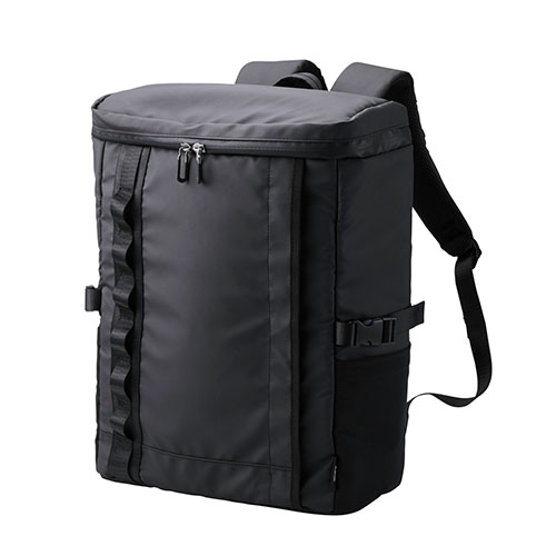 ボックスバックパック■ボックス構造と幅広マチで、15.6インチまでのパソコンやA4サイズの書類、2〜3日分の着替えなどを同時に収納できるバックパックです。■上部が大きく開くので、荷物をスムーズに出し入れできます。■前面にあるデイジーチェーンは、カラビナなどを取り付けるのに便利です。■前面横のファスナーポケットは、小物やすぐに取り出したいアイテムを収納するのに便利です。■15.6インチまでのノートパソコンやタブレットが収納できる、クッション内蔵の内装ポケットを備えています。移動中の揺れによる中の荷物との衝突を防ぎます。■ポケット内のキーリングに鍵を付けると紛失しにくく、使いたいときにサッと取り出せます。■内装にはケーブルやペンを収納できるループが付いているため、ガジェットや文房具を整理しながらすっきりと収納できます。■両側面には、折りたたみ傘やペットボトルなど収納できるサイドポケットが付いています。背負ったままの出し入れもしやすく便利です。■背面には、盗難防止にもなるファスナー開閉式の隠しポケットを装備。財布やスマートフォンなどの貴重品を安心して収納できます。■背面は通気性のあるメッシュ素材を採用し、蒸れを防いで快適に背負えます。■厚手のショルダーベルトとチェストベルトによって、バッグが体にフィットし、体にかかる荷重を分散させます。■イヤホンなどの小物を収納するのに便利なポケットがショルダーベルト部分に付いています。■ショルダーベルト部分に反射板が付いているので、夜道の歩行も安心です。■シンプルなデザインで、通勤や通学、出張など幅広いシーンで活躍します。■水がしみ込みにくい樹脂コーティング生地を採用しています。■※完全に水の侵入を防ぐものではありません。■背面にキャリーバーへ固定できるキャリーベルトを配置しています。キャリーケースと一緒に持ち運べるので移動がスムーズになります。■自社環境認定基準を1つ以上満たし、『THINK ECOLOGY』マークを表示した製品です。■環境保全に取り組み、製品の包装容器が紙・ダンボール・ポリ袋のみで構成されている製品です。■容量 : 約30L■外形寸法 : W約340mm×D約180mm×H約460mm ※ハンドル・ショルダーベルト含まず■気室数 : 1■内寸 : W約258mm×D約22mm×H約360mm ※15.6インチノートパソコンの参考収納寸法■対応モデル : 15.6インチまでのMacBook Pro/Air、Surface、Chromebook、HP・Dell・Lenovo・ASUSなどのノートパソコン■PC収納部内寸備考 : W約258mm×D約22mm×H約360mmまでの端末の収納に対応します。記載のサイズ以下でも形状等により対応しない場合があります。最新の対応情報はエレコムホームページでご確認ください。■ポケット(前面) : ファスナーポケット×1■ポケット(背面) : ファスナーポケット×1■ポケット(側面) : オープンポケット(ストレッチメッシュ)×2■ポケット : ショルダーポケット×1■ポケット(気室内) : パソコン用ポケット×1、タブレット用ポケット×1、ファスナーポケット×2、ファスナーポケット(メッシュ)×1、オープンポケット×3、仕切りポケット×1■カラー : ブラック■材質 : PUコーティングポリエステル■質量 : 約990g■表面加工 : PUコーティング■その他 : キーホルダー×1、キャリーベルト入浴剤dおまけつき(商品とは関係ありません)別送