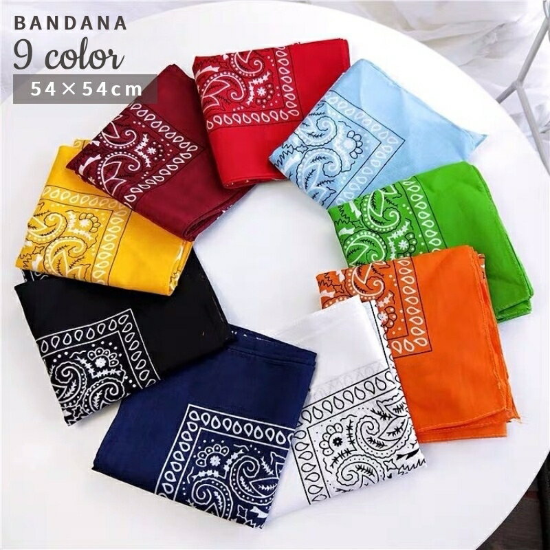 定番柄のバンダナ おしゃれ用としてネック周りやバッグに巻いたり、 ハンカチ代わりに、お弁当を包んだりと使い道はさまざまです。 【サイズについて】 54*54cm 【カラーについて】 生産ロットにより柄の出方や色の濃淡が異なる場合がございます。 お使いのモニターや撮影時の光の加減などに より画像と実際の商品のカラーが異なる場合もございます。 予告なしにカラーやデザインなどの変更がある場合もございます。 【素材について】 ポリエステル 【補足説明】 ※色落ちする場合がございます 手洗い後、ご着用くださいますようお願い致します。