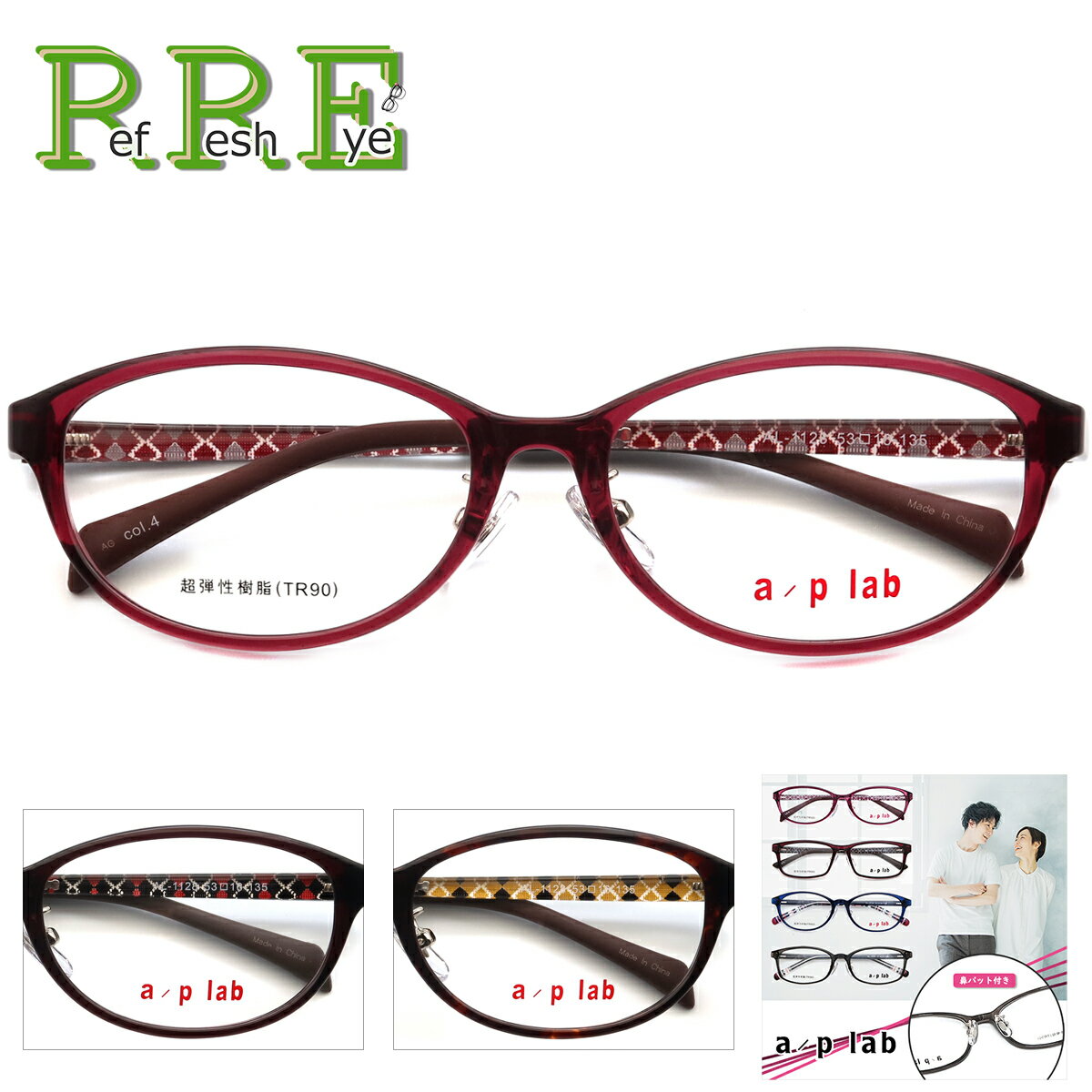 メガネ 度付き 鼻パッド付 AL1128 53サイズ 軽量 TR90 グリルアミド a/p lab レンズ付き眼鏡セット メガネ通販 度付きメガネ