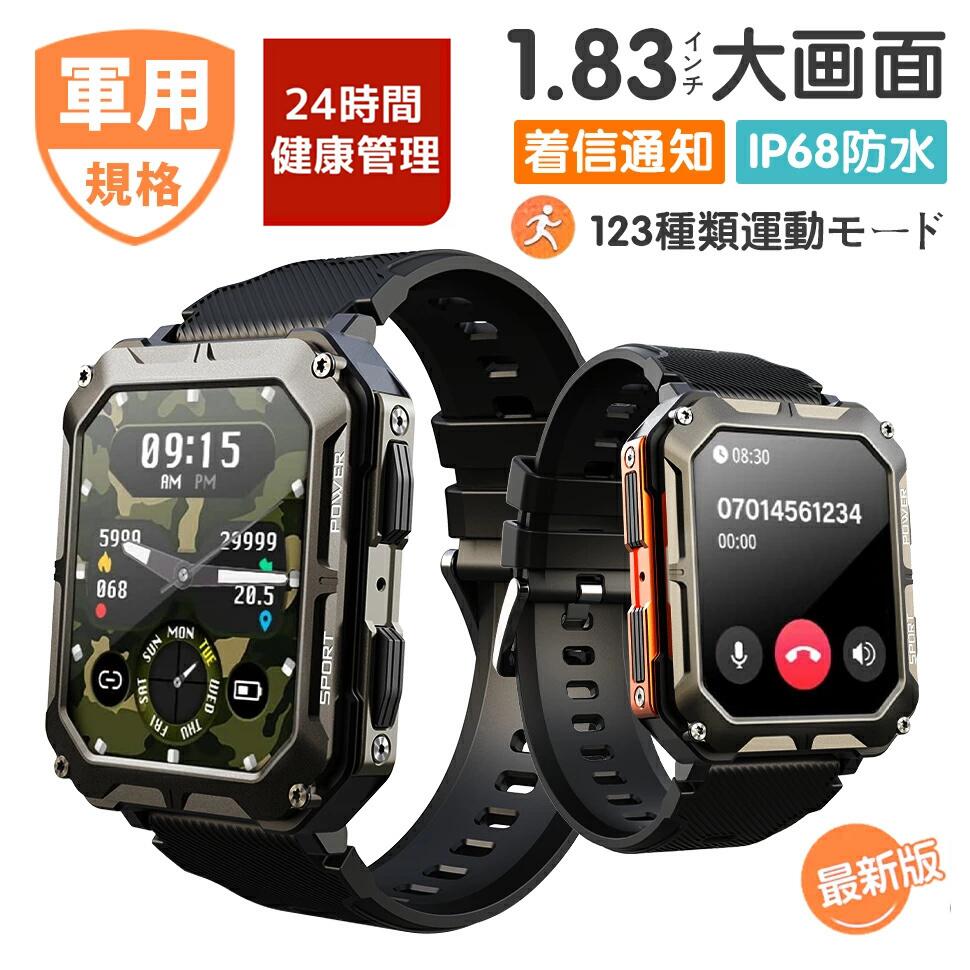 軍用規格】スマートウォッチ 日本製センサー 通話機能 1.83インチ大画面 耐衝撃 傷防止スクリーン 123種類運動モード 音楽再生 Line着信受付 振動強度調整 低消費電力 IP68防水 音声アシスタント 電卓 天気予報 Android対応