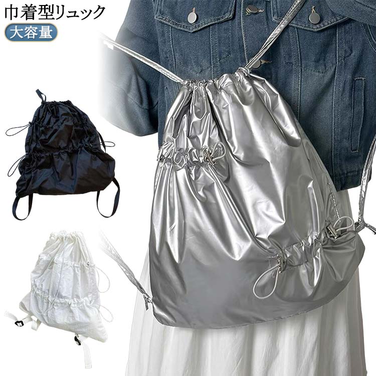 【3color】【巾着型リュック】巾着式メイン口でくしゅっと閉められ、取り出しが便利になります。柔らかくとても軽量なのが嬉しい!カジュアルからきれいめなスタイルまで取り入れられます。普段使いだけでなく、旅行やアウトドアにもおすすめ。使わない時に、コンパクトに畳んで保管します。 サイズ F サイズについての説明 サイズ約43*43*1cm 素材 ポリエステル 色 ホワイト ブラック シルバー 備考 ●サイズ詳細等の測り方はスタッフ間で統一、徹底はしておりますが、実寸は商品によって若干の誤差(1cm〜3cm )がある場合がございますので、予めご了承ください。 ●商品の色は、撮影時の光や、お客様のモニターの色具合などにより、実際の商品と異なる場合がございます。あらかじめ、ご了承ください。 ●製品によっては、生地の特性上、洗濯時に縮む場合がございますので洗濯時はご注意下さいませ。 ▼色味の強い製品によっては他の衣類などに色移りする場合もございますので、速やかに(脱水、乾燥等)するようにお願いいたします。 ▼生地によっては摩擦や汗、雨などで濡れた時は、他の製品に移染する恐れがございますので、着用の際はご注意下さい。 ▼生地の特性上、やや匂いが強く感じられるものもございます。数日のご使用や陰干しなどで気になる匂いはほとんど感じられなくなります。