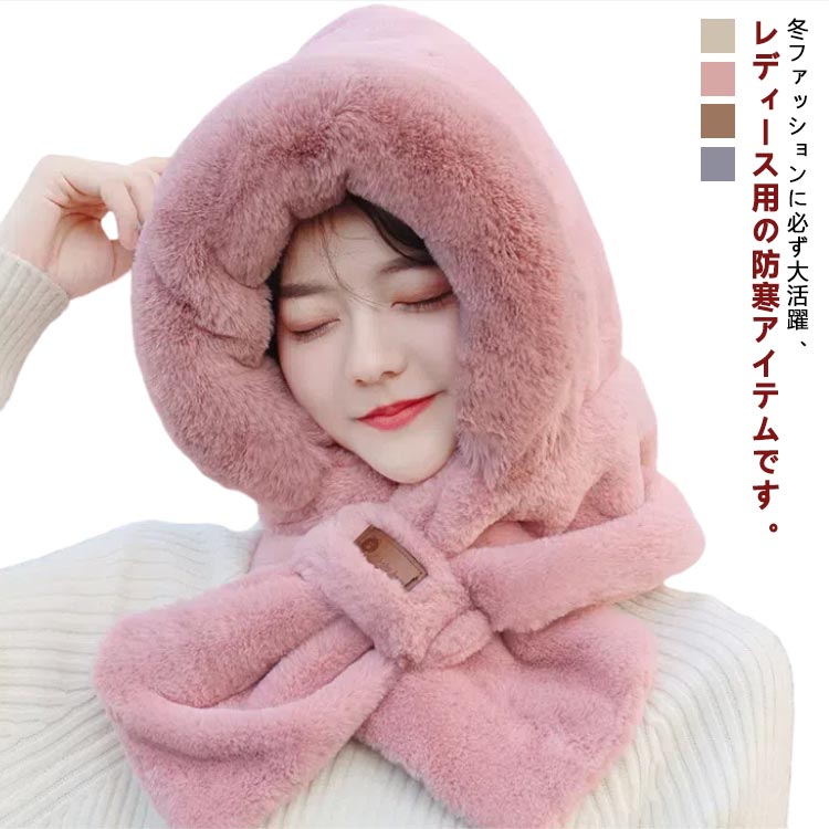 レディース 秋冬 暖かい 耳保護 帽子 フード付きマフラー ふわふわ ネックウォーマー フェイクファー 軽い フリース スカーフ 一体化マフラー 防寒 可愛い もこもこ 無地 防寒対策 暖かい ファー帽
