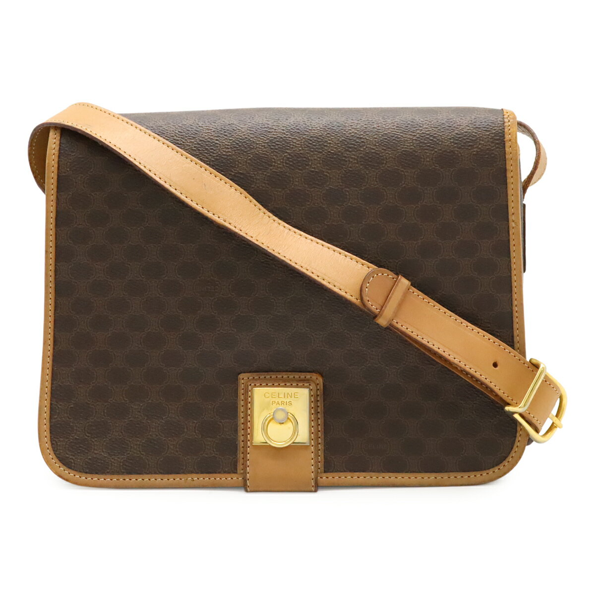 CELINE セリーヌ マカダム柄 ショルダーバッグ 斜め掛け ポシェット フラップ PVC レザー ダークブラウン ベージュ ゴールド金具 【中古】