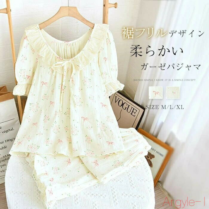 【送料無料】ガーゼ パジャマ レディース ルームウェア 夏 半袖 ロングパンツ 総柄 部屋着 花柄セットアップ 2点セット 寝間着 寝巻き 上下セット 裾フリルデザイン 可愛い