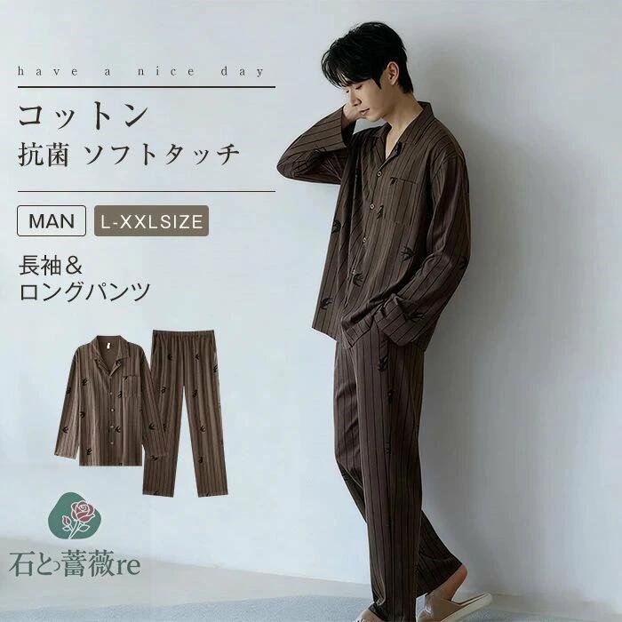 綿 パジャマ メンズ 上下セット トップス ボトムス 長袖 春 秋 冬 前開き シャツ ストライプ 刺繍 つばめ ロングパンツ ワイド ウエストゴム セットアップ ルームウェア 2点セット 男性 部屋着 寝間着 寝巻き おそろい コットン ソフト ストレッチ 抗菌 消臭 プレゼント