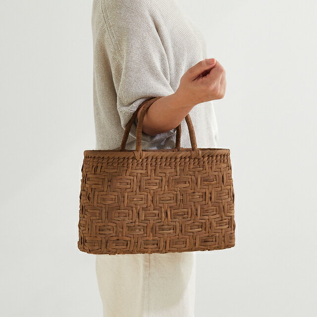 商品詳細 企画デザイン/かごや 作製/自社工房(中国) 素材/やまぶどう(中国) ※自然素材を使った手作り品のためサイズや色合いは多少異なります。 関連するカテゴリー やまぶどうへ→ 中サイズへ→ 横長へ→ ▲ページトップへ連続桝網代編みやまぶどう籠(細ひご/横長/中サイズ) 美しいダイヤ模様が浮き出ます 角度によって様々な表情をみせてくれる連続桝網代編み。使い込むほどにツヤが増し、美しいダイヤ模様が浮かび上がってきます。ひと味違うファッションを楽しみたい方や、二個目のかごバッグをお探しの方に人気です。 幅約6~7mmの細ひごを使用しているので、全体のラインも上品に仕上がりました。 卓越した職人技が光ります。 持ったときのバランスがGOOD 底部分が長方形で口部分が楕円になっている定番の横長タイプです。小柄な方にも、背の高い方にもバランスよく合わせていただけます。 A4サイズが横に入ります。必需品プラスαが入る嬉しいサイズ感は、お仕事や習い事など、いろいろなシーンで活躍します。 [容量の目安]長財布、携帯電話、ハンカチ、ポーチ、400ml水筒、A4サイズの本、iPad、折りたたみ傘が入っています。 あたたかみある素朴な風合い やまぶどうの蔓の一番上にあるオニ皮(バサバサした皮)を剥いた際、最初に出てくる皮を使用しています。素朴であたたかみある風合いが魅力です。使い込むことによってツヤが増し、あめ色に変化していきます。 ふちは、八の字編み。丈夫で見た目がよいです。 シンプルな立ち取手。すっきりとした印象になります。巻きの中に一本ひごが入り、ゆるみにくい作りになっています。 底部分も丁寧に編み込まれています。ひごに小さな穴があいておりますが、くぎで木型に固定したときのものです。予めご了承ください。 ツヤツヤに育っています ツヤがでて、くっきりと模様が目立ってきています。 「アンド プレミアム」1月号に紹介されました P70「冬にもカゴバッグを持つ。」で紹介されました。あたたかみがあり、しっかりとした素材感のかごバッグは、厚手のアウターにも合わせやすく、秋冬も使うことで、色ツヤが深まります。 お客様からのうれしい声届いています おかげさまで楽天ランキングに入賞しました。