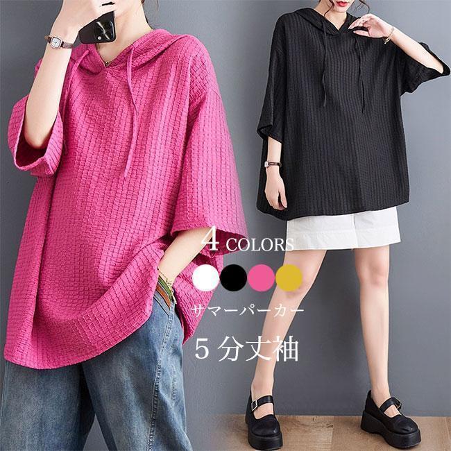 レディース ドロップショルダー 5分丈袖 パーカー フード付 オーバーサイズ 薄手 体型カバー サマーパーカー Tシャツ 夏 半袖Tシャツ