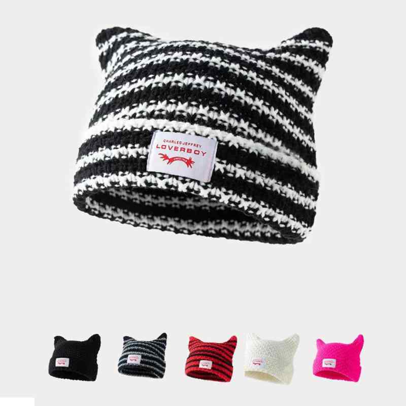 帽子 猫耳 ニット ストライプ ピンク 手作り 暖か 秋冬 キッズ 休闲
