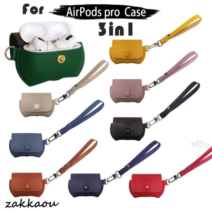3in1 AirPods Pro 用保護カバー レザー風 シンプル イヤホンケース ストラップ付き エアーポッズケース CASE 耐衝撃 お洒落 ケース 衝撃 保護 収納 アクセサリー